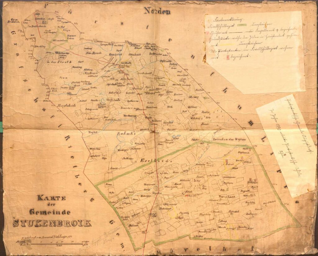 (hf) Die Gemeindekarte aus dem Jahr 1859 wurde vom gebürtigen Stukenbrocker Bernard Dahlmeier angefertigt, der ab 1857 Lehrer an der Forellschule war, bis er 1864 nach Sandebeck versetzt wurde. Eine Besonderheit der Karte ist, dass Dahlmeier die Grenzsteine zu den Nachbargemeinden Liemke und Augustdorf eingezeichnet hat.