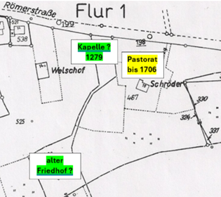 Viele, so wie auch Heinz Tölke in seinem Heimatbuch vermutet sie dort an der Römerstraße, wo sich bis zum Jahre 1706 auch noch das Pastorat befand. (Tausch 1706 mit dem Schröders Hof von 1595, dem Standort des heutigen Pastorats).