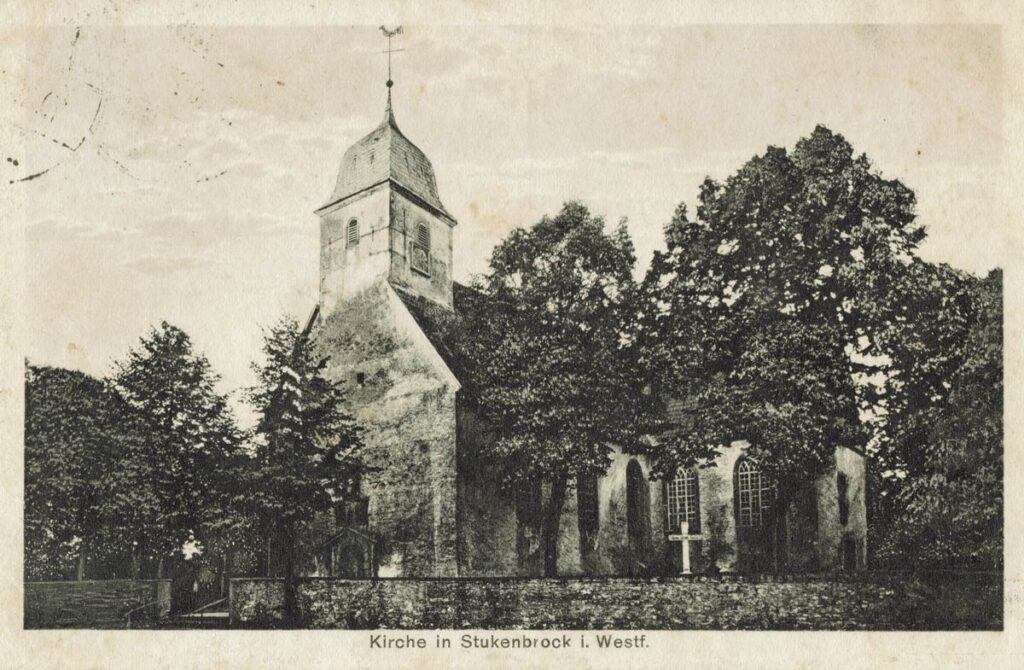 Eine alte Ansichtskarte aus Stukenbrock zeigt die Kirche vor dem Bau des imposanten, wuchtigen Glockenturms im Jahr 1936. Deutlich erkennbar die Gräber um die Kirche.